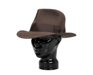 An iconic silhouette, the Expedition Shape is inspired by the Raiders of the Lost Ark Fedora design. A shape of great individualised character, it is notably an aggressively bashed fedora with a tight centre pinch and a sweeping brim. Reminiscent of a character that has endured a lot more than his fair share of adventures.